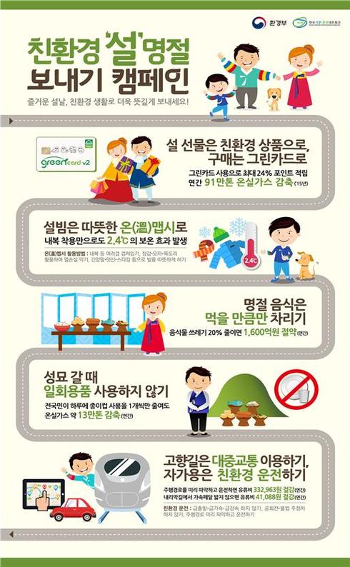 [시사인경제]환경부는 이번 설을 맞이하여 온실가스를 줄이면서 뜻 깊은 명절을 보낼 수 있는 ‘5가지 친환경 실천수칙’과 이에 기반을 둔 ‘친환경 설 명절 보내기 캠페인’을 추진한다고 밝혔다.