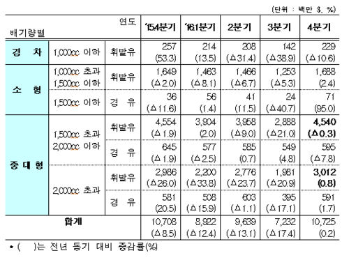 수출평균단가는 전년 동기 대비 0.8% 증가하였으며, 수출 주력 품목인 중형(1,500∼2,000cc) 휘발유 차량이 5분기 연속 수출 단가 상승세를 보이며 전체 승용차 수출단가 상승을 견인했다.