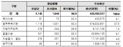 공공부문 2,145개 기관 중 조사에 응한 1,949개(90.9%) 기관과 2015년 종합건설사업자 시공능력평가(대한건설협회)에 의한 도급순위 상위 51개사를 대상으로 조사한 결과이다.