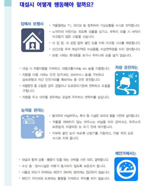 국민안전처 이한경 재난대응정책관은 주말에 눈이 내리는 지역을 찾는 관광객은 체인 등 월동 장비를 챙겨 오르막길 등에서 차량 흐름을 방해하는 일이 없도록 준비해야 하며, 내 집, 내 점포 앞에 쌓인 눈을 치워 안전사고를 미연에 방지해 줄 것을 부탁드린다고 밝혔다.