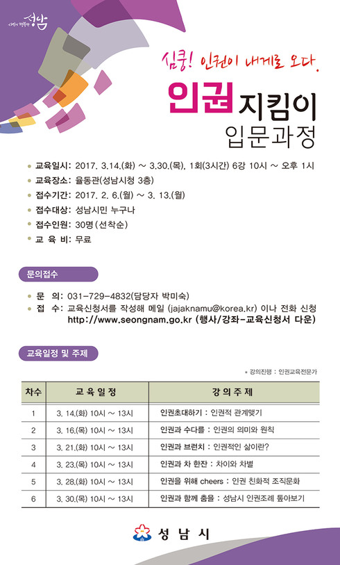 [시사인경제]성남시는 시민 대상 ‘인권지킴이 입문 과정’을 개설해 오는 3월 13일까지 교육생 30명을 모집한다고 밝혔다.