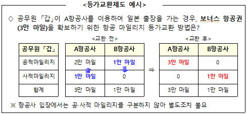 공적 항공마일리지 활용 제고를 위해 항공사 간 등가교환 제도를 도입한다. 2개 이상 항공사의 공적 항공마일리지를 보유하고 있는 공무원이 특정 항공사(A)의 공적 항공마일리지와 사적 항공마일리지를 합산하여 보너스 항공권 등을 확보할 수 있는 경우에는 타 항공사(B)의 공적 항공마일리지와 특정 항공사(A)의 사적 항공마일리지 간 등가교환이 가능하도록 개선한다.