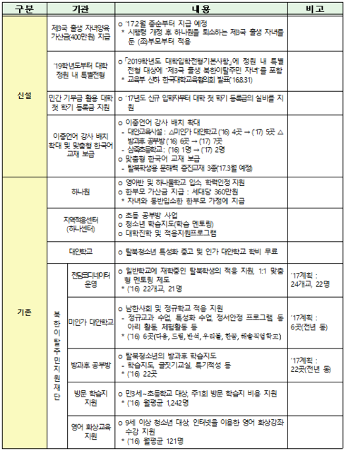 | 제3국 출생 탈북민 자녀 지원 관련 제도개선 현황 |