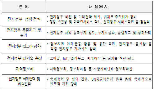추천 분야는 전자정부 정책·전략, 전자정부 품질제고 및 관리, 전자정부 인프라 강화, 전자정부 신기술 촉진, 지역정보화, 전자정부 국제협력 및 해외진출 등 6개 분야이며, 유공자로 추천·선정된 기관·개인에게는 포상의 공정성과 영예성을 위하여 실사 및 공개 검증 과정을 거쳐, 향후 개최될 전자정부 50주년 기념식 행사에서 정부 포상을 수여한다.