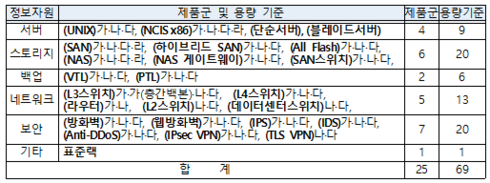 스토리지 부문에서는 가급과 나급의 용량기준(각 450TB, 300TB)을 기존 대비 2배 상향 조정하여, 센터 내부의 업무시스템별 개별 스토리지를 대형 스토리지로 통폐합 할 수 있도록 지원함으로써 스토리지 구매량과 전산실에서 차지하는 공간을 모두 줄일 수 있도록 했다. 또한, 전통적인 하드디스크 스토리지보다 전산실 공간과 전기사용량을 70% 이상 절감할 수 있는 ‘All Flash 스토리지’를 센터에 도입할 수 있도록 규격을 신설했다.