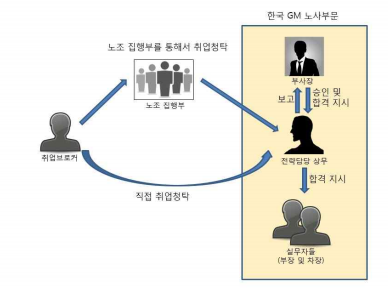 정규직 채용 과정에 있어서, 노조 지부장 등 채용브로커들이 거액의 금품을 수수한 후 인사담당 회사측 임원에게 채용 청탁을 하고, 회사 노사부문은 노조 집행부 등의 채용 청탁시 노조와의 원만한 관계유지 등의 명목으로 성적 조작 등의 불법적인 방법을 동원하여 합격시킨 비리를 적발하고, 납품업체 선정 과정에서, 노조 핵심간부들은 납품브로커를 통하여 업체로부터 거액의 금품을 수수한 후 회사측 임원에게 업체 선정을 청탁하고, 회사측 임원은 노조간부로부터 수천만 원의 금품을 수수한 후 이들이 원하는 업체를비정상적인 절차를 통해 납품업체로 선정하는 비리를 확인했다.