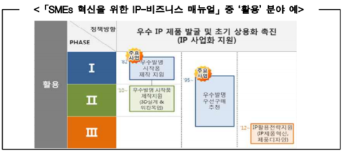 ‘IP 비즈니스 매뉴얼’은 선행기술 조사, 특허경영전문가 파견 등 IP 창출 관련 6개 사업, 우수발명 시작품 제작, 특허기술 평가 지원 등 IP 활용 관련 12개 사업으로 구성되어 있다.