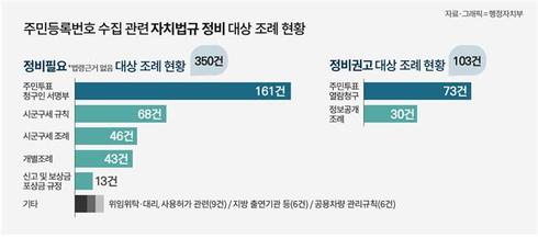 이번에 정비 대상이 되는 자치법규는, 법령에 근거 없이 주민등록번호를 요구하는 자치법규 350건과, 상위법과 동일한 내용을 규정하여 조례에서 주민등록번호의 수집을 요구할 필요가 없는 자치법규 103건을 포함한다.