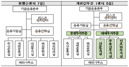 또한, 향후 대체투자 규모의 지속적인 확대, 수익성 제고를 위한 투자다변화 등에 부합하는 대체투자 조직 강화가 필요하다는 인식아래, 지역별(국내, 해외)로 구분된 조직체계를 투자성격이 유사한 자산별로 사모투자실·부동산투자실·인프라투자실로 개편할 계획이다.