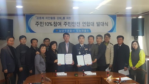 [시사인경제]남양주 도농·지금행정복지센터에서는 28일 민·관·경 협업 네트워크를 구축하여 안전하고 살기 좋은 우리 동네 만들기 프로젝트를 추진하기 위해 도농동장과 도농파출소장 및 도농동 사회단체장 11명 등이 참석한 가운데『주민10%참여 주민안전 프로젝트 협약식』을 가졌다고 밝혔다.