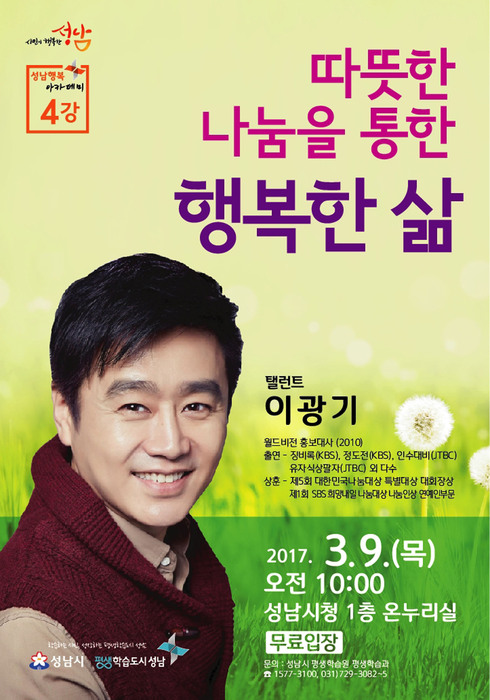 [시사인경제]성남시는 탤런트 이광기(48) 씨를 초청해 오는 9일 오전 10시 시청 온누리에서 성남행복아카데미 4강을 연다고 전했다.