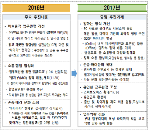 행정자치부는 그동안 비효율적인 업무관행을 개선하기 위해 소통과 협업을 정착시키고 서로 존중하고 배려하는 조직 문화 조성을 위해 많은 노력을 했다.