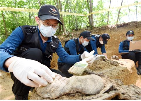 | 국방부 유해발굴감식단 발굴병들이 6․25전사자 유해를 발굴하고 있다. |