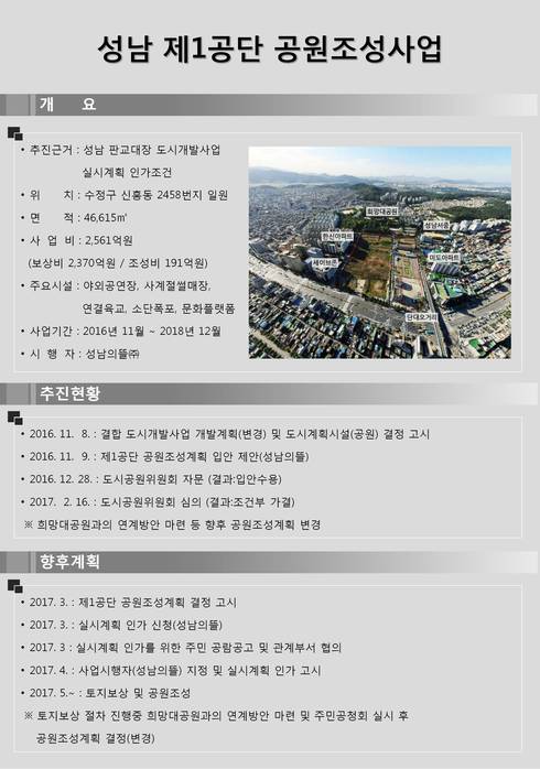이어 “성남시는 앞으로 제1공단 공원조성사업과 대장동 도시개발사업을 성공적으로 추진하고, 개발이익금의 사회 환원이라는 지역개발 역사의 새로운 지평을 열어가겠다”고 덧붙였다.