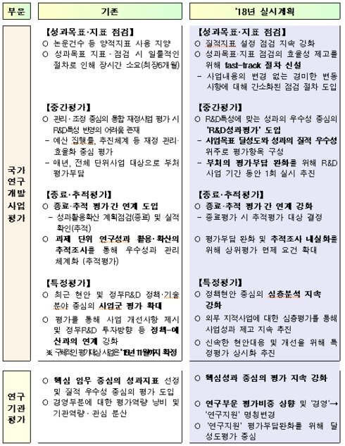 2018년도 실시계획은 성과평가 기본방향의 이행을 위하여 국가연구개발사업 및 출연연구기관 기관평가에 대한 세부적인 추진방향을 담고 있다.