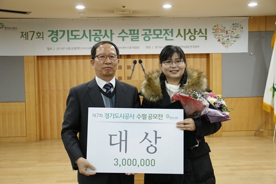 【경기인뉴스】박진영 기자 = 경기도시공사와 국제PEN한국본부가 공동주최한 제7회 경기도시공사(사장 최승대) 수필공모전 ‘행복공간 도시, 도시 속 삶의 이야기’ 시상식이 26일 개최됐다.이날 공사 강당에서 열린 시상식에는 최승대 경기도시공사 사장 등 공사 임직원, 국제 PEN한국본부 김경식 사무총장, 김후란 심사위원장, 그리고 본상 수상자 5명과 가족들이 참석했다.대상 수상의 영예를 안은 장미화 씨는 “이웃과 함께 살아가는 행복공간 도시에 대해 다시 한번 생각하게 되었다며, 평범한 주부가 이런 상을 받게돼 영광이다”고 수상 소감을 밝혔다.김후란 심사위원장(문학의집 서울 이사장)은 “해를 거듭할수록 응모작 수준이 우수해 감탄해마지 않게된다”며 “사람들 누구나 삶의 빛깔과 삶의 궤적이 다르지만 그 마음 바탕에 고여흐르는 따뜻한 인간미와 삶의 진정성은 참으로 귀한 것임을 재인식할 수 있었다”고 총평했다.본상 수상작은 △대상 「추운 겨울날의 난로」(장미화, 여‧45세)를 비롯해 △우수상 「해묵은 책갈피 속의 삼화 하나」(진상용, 남·61), 「사람의 소리」(조하영, 남·23) △장려상 「사람 사는 곳에서 정원이 자라난다」(박새롬, 여·24), 「Dear.도시」(김세훈, 남·32), 「손수레에 사랑을 싣다」(이현우, 남·35) 등이다. 공모전 당선자들에게는 대상 1명에 300만원, 우수상 2명에 각 200만원, 장려상 3명에 각 50만원, 입선자 50명에 각 3만원 상당의 상품권 등 총 1,000만원의 상금이 지급된다.최승대 경기도시공사 사장은 “다양한 연령대와 지역에서 공모전에 참여해주신 모든 분들과 수상자들께 깊은 감사와 축하를 드린다” 며 “내년에도 많은 분들이 참여하실 수 있도록 공모전을 진행할 계획”이라고 밝혔다.한편, 지난 11월 12일 ~ 12월 11일 ‘행복공간 도시, 도시 속 삶의 이야기’를 주제로 접수 신청을 받은 제7회 경기도시공사 수필공모전에는 총 656편의 응모자가 참가해 대성황을 이뤘다.