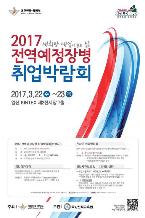 [시사인경제]국방부는 오는 22일, 23일 양일간 일산 킨텍스(KINTEX)에서 국방인재 1,500여 명을 채용하는 『2017 전역예정장병 취업박람회』를 개최한다고 밝혔다.
