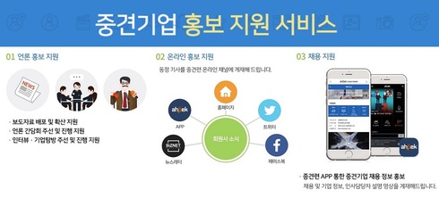 ‘중견기업 홍보 지원 서비스’는 대언론 홍보, 온라인 홍보 및 채용정보 확산 지원 등으로 구성되며, 현장의 목소리를 반영해 추가적으로 개선·확대해 나아갈 예정이다.