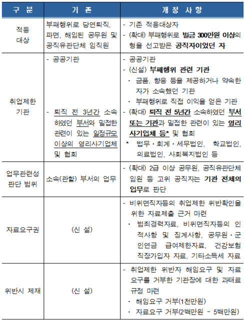 개정 전『부패방지권익위법』제82조(비위면직자 등의 취업제한)에 따르면, 공직자가 재직 중 직무와 관련된 부패행위로 당연퇴직, 파면 또는 해임된 경우 공공기관, 퇴직 전 3년간 소속했던 부서의 업무와 밀접한 관련이 있는 일정 규모 이상의 영리사기업체 등에 취업하는 것을 5년 간 금지한다고 규정되어 있다.