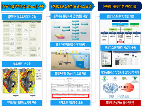 이에 해양수산부는 관련분야 기술을 조속히 개발하기 위해 해양환경관리공단(KOEM)을 주관기관으로, 서울대학교와 한국해양과학기술원(KIOST)을 블루카본 공동연구기관으로 선정했다. 세 기관은 올해부터 2021년까지 5년 간 ▲ 국내 블루카본의 유형별 현황조사 및 통계 산출 ▲ 블루카본 탄소순환 프로세스 규명 ▲ 블루카본 흡수량 측정·검증 및 국제인증전략 제시 등 연구를 수행한다.