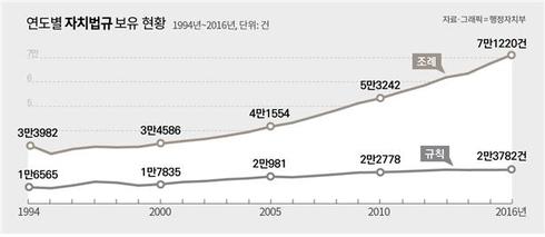 주민 생활에 큰 영향을 미치는 자치법규의 수는 지속적으로 증가하고 있다. 조례 기준으로 2010년 5만3242건에서 2016년 7만1220건으로 18000여 건이 증가했다. 이는 매년 3000건 가까이 늘어난 것으로 개정되는 자치법규는 포함하지 않은 수치다.