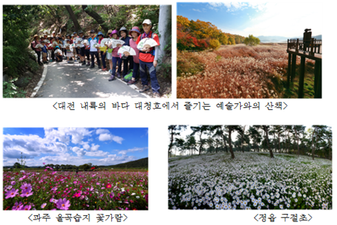 이번에 선정된 대전시의 ‘내륙의 바다 대청호에서 즐기는 예술가와의 산책’은 연간 관광객 120만 명이 찾는 대청호 오백리길 6개 구간 59km 가운데 4구간(대전 추동 일원)을 주요 기반으로 한다. 지역민들이 안내하고 관리하는 이곳에서는 ▲시인, 도예가 등 지역 예술가와 함께하는 오백리길 탐방(투어), ▲대청호 담수로 터전을 잃은 어르신들의 인생 이야기를 듣고 기록하는 채록과 옛 기억을 보듬는 이야기 마당, ▲관광객들에게 청정 문화 환경의 소중함을 일깨우는 알찬 생태체험 프로그램 등을 진행한다.