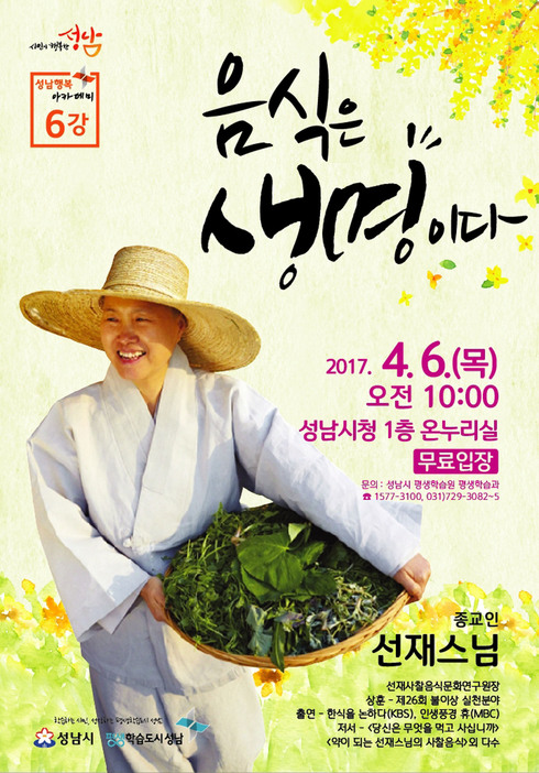 [시사인경제]성남시는 ‘사찰음식의 대가’라 불리는 선재스님(61)을 초청해 오는 6일 오전 10시 시청 온누리에서 성남행복아카데미 6강을 연다고 밝혔다.