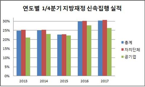 이는 지난 5년간 1/4분기 평균 집행률 26.23% 대비 4.12%p 증가한 실적이다. 이같은 성과는 지역경제 활성화를 위한 정부, 자치단체의 강력한 의지와 중앙부처, 전 자치단체 및 공기업이 힘을 합쳐 적극 추진한 결과로 풀이된다.