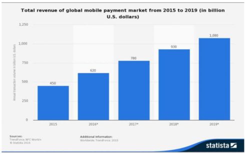 시장조사기관 트렌드포스(TrendForce)에 따르면, 올해 글로벌 모바일 결제시장규모는 지난해보다 25.8% 성장한 7,800억 달러(약 895조원)에 달할 것이며, 2019년에는 무려 1조 800억 달러(약 1,140조원)까지 급성장할 것으로 전망했다[붙임 5]. 이처럼 모바일 결제시장이 커지고 있는 이유는 스마트폰 이용자들이 자기 손에서 간편하게 이용하고 싶어하는 생활패턴의 변화 때문인 것으로 풀이된다.