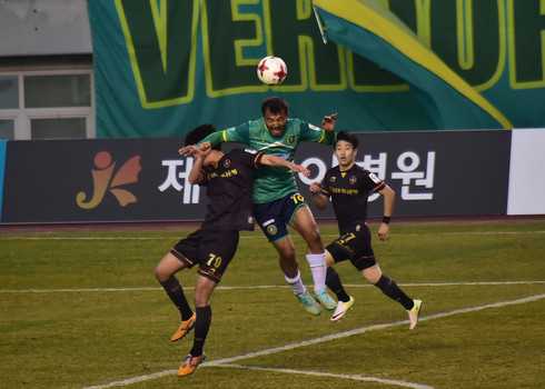 | 안산 나시모프 선수(중앙)가 부천 선수 2명과 공중볼을 다투고 있다 |