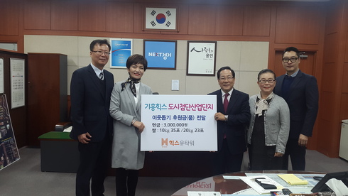 ㈜금당테크놀로지는 기흥힉스도시첨단산업단지 시행을 맡은 부동산 개발 시행사로 개업식 선물로 화분 대신 쌀을 받아 이날 기부했다.