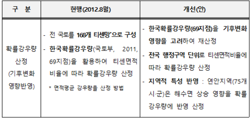 구체적으로 최근 방재성능목표를 초과하는 집중호우로 인한 피해*가 자주 발생함에 따라, 이러한 이상기후 현상에 대비하기 위해 기후변화 시나리오*에 따라 시·군별로 강우량이 얼마나 증가하는지, 또, 해수면 상승으로 인한 침수위험성은 얼마나 증가하는지를 분석하여, 그 영향을 방재성능목표에 반영했다.