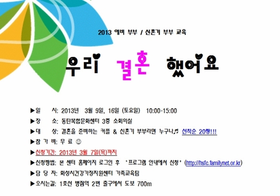【경기인뉴스】채의선 기자 = 화성시건강가정지원센터가 3월 9일과 16일 두 차례 동탄복합문화센터 3층 소회의실에서 결혼을 준비하는 예비부부와 신혼기부부를 위한 교육을 실시한다. 이번 교육은 이동순 한국부모교육센터 소장으로부터 내 인생의 패턴 알아차리기와 극복하기, 내가 원하는 부부관계, 행복한 가정, 문제해결방법, 부부대화법 등 부부 관계에 필요한 내용들로 채워진다. 센터 관계자는 “신혼기는 가장 행복한 시기일 것 같지만, 다른 문화와 생활습관을 가진 두 사람이 만나 실제 생활을 함으로써 가장 갈등이 고조되는 시기” 라며 “서로간의 이해와 차이를 받아들이고 해결방법을 터득하는 교육이 필요하다” 며 많은 시민들이 이번 교육에 관심을 당부했다. 참가신청은 3월7일까지 화성시건강가정지원센터 홈페이지(http://hsfc.familynet.or.kr)에서 가능하며 참가비는 무료이다. 자세한 사항은 화성시건강기정지원센터 가족교육팀(031-267-8781)로 문의하면 된다.