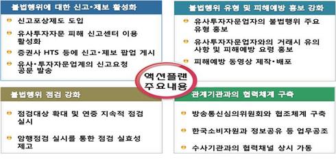유사투자자문업자의 불법행위 혐의에 대한 양기관의 상호 정보공유와 방심위의 심의강화 등을 주요내용으로 하는 협조체계를 구축하여 추진한다.
