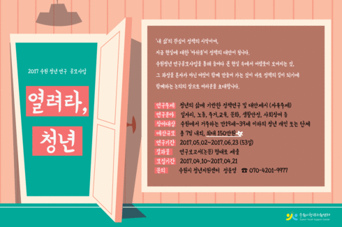 [시사인경제]수원시 청년지원센터는 21일까지 수원 청년 연구 공모사업 ‘열려라, 청년’ 신청자를 모집한다고 밝혔다.