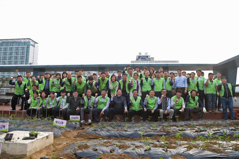 이날 구청 직원들은 텃밭을 일궈 상추, 고추, 방울토마토 등 농작물 10종, 500개 모종을 심었다.
