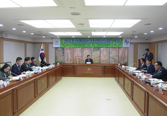 【경기인뉴스】박진영 기자 = 수원시와 수원시교육지원청, 수원 각 경찰서 등 유관기관들이 학교폭력 예방을 위해 한자리에 모였다. 지난 29일 시청과 교육지원청, 각 경찰서 및 유관단체 관계자 등 20여 명이 참석한 가운데 윤성균 제1부시장의 주재로 학교폭력예방대책지역협의회를 시청 상황실에서 개최했다. 이날 회의에서는 새정부의 청소년 정책과 학교폭력근절대책 방향에 대한 소개에 이어 시와 교육지원청, 각 경찰서의 학교폭력예방 추진계획에 대한 협력 방안을 토의하는 시간이 진행됐다. 각 기관에서 추진하는 학교폭력 예방시책에 대한 사례도 공유했다. 수원시에서는 현재 학교폭력대책지역협의회를 구성해 지역사회 지원, 학교폭력예방을 위한 민간협력 강화, 위기청소년 지원 상담, 인성교육 및 폭력예방 프로그램, 학교폭력예방 지역사회 분위기 조성 등의 5개 분야에서 33개 사업을 추진하고 있다. 이와함께 위기청소년을 또래 친구들의 상담을 통해 조기에 발견하고 통합지원체계로 연계해 의료․보호․자활 등의 서비스를 지원하는 ‘1388 청소년지원단’을 교육지원청과 경찰서, 청소년상담센터 등 42개 기관과 협력․추진하고 있다. 또한 수원교육지원청은 학교폭력전담기구 구축, 스쿨폴리스 및 어머니폴리스, 생활인권지원센터 운영 등 20개 사업을 추진 중이며, 각 경찰서는 청소년 우범지역을 순찰하는 해피로드, 가해학생 경찰체험, 학교전담 경찰관 등의 사업을 진행하고 있다.