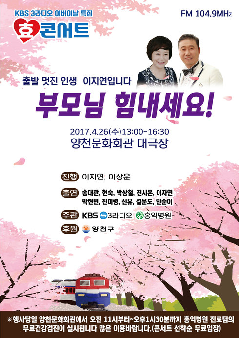 [시사인경제] KBS 3라디오 출발 멋진 인생 이지연입니다(FM 104.9MHz, AM 1134KHz 매일 오후 2시 방송)에서는, 4월 26일 오후 2시부터 양천문화회관 대극장에서, 어버이날 특집 孝콘서트 ‘부모님 힘내세요’를 개최한다.