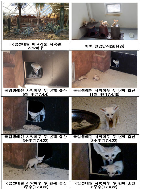 국립생태원에는 지난 2014년 4월 아프리카 수단에서 불법 밀수되어 인천세관에 적발된 사막여우 17마리 중 살아 남은 5마리(암컷 2, 수컷 3)가 있었으며, 이 중 암컷 한 마리가 지난해 7월 초 암수 한 쌍을 출산했다.