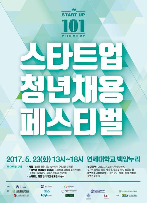청년위원회, 중소기업청 등 정부기관과 청년희망재단, 서울산업진흥원 등 민간기관 및 연세대학교 등 7개 대학이 연합하여 5월 23일, 연세대(백양누리)에서 '스타트업 청년채용 페스티벌'을 개최한다.