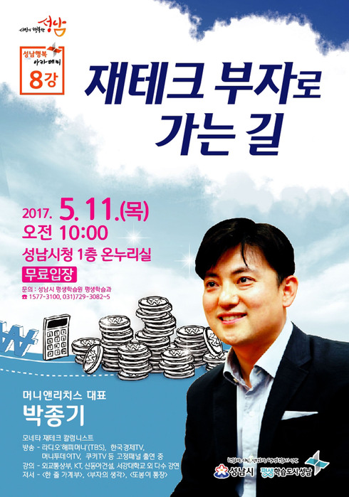 [시사인경제] 성남시는 ‘재테크 전문가’로 불리는 박종기 머니앤리치스 대표를 초빙해 오는 11일 오전 10시 시청 온누리에서 성남행복아카데미를 연다고 밝혔다.
