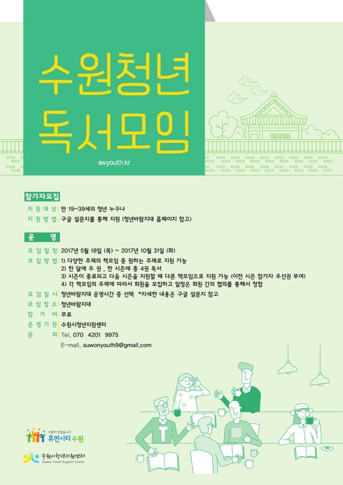 [시사인경제] 수원시 청년지원센터는 청년들이 공유할 수 있는 주제의 책을 읽고, 토론하고 교류하는 ‘수원청년 독서모임 시즌1’ 참여자를 14일까지 모집한다.