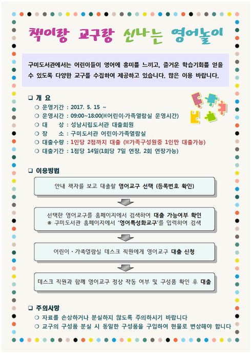 [시사인경제] 성남시 구미도서관은 15일부터 영어 교구 대출 서비스를 시작했다고 밝혔다.