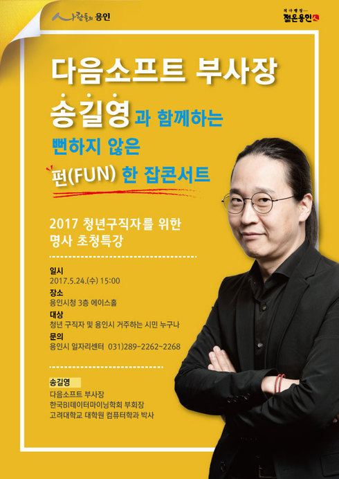 용인시는 오는 24일 오후 3시 시청 에이스홀에서 송길영 다음소프트 부사장 을 초청해 잡 콘서트 ‘2017 청년구직자를 위한 명사 초청특강’을 진행한다.