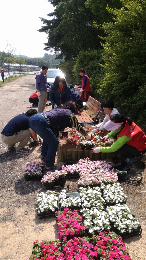 [시사인경제] 시흥시 정왕본동주민센터는 골목자치활성화 사업의 일환으로 정왕본동 통장협의회, 주민자치위원회, 지역주민(50여 명)과 함께 5월 16일 뒷방울저수지 남측 산책로 (정왕동 산22-3, 산35-1)에 능수버들과 초화류 등을 식재하여 꽃밭을 조성했다.