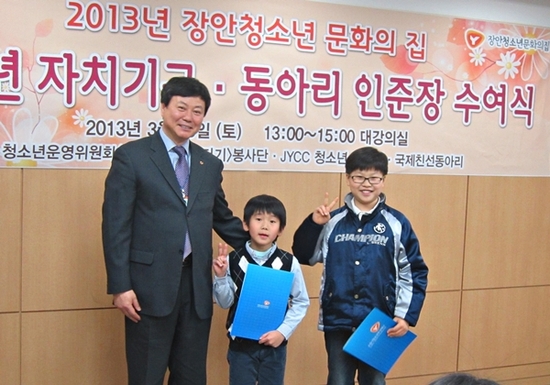 【경기인뉴스】임성택 기자 = 창의적이고 자기주도적인 청소년 활동에 힘쓰고 있는 수원시청소년육성재단의 장안청소년문화의집에서 2013년도 문화의집을 대표하는 청소년들로 구성된 청소년 자치기구 및 동아리연합에 대한 인준장 수여식을 23일 개최하였다.
