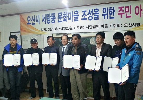 【경기인뉴스】임성택 기자 = 오산시(시장 곽상욱)는 관내 서랑동 문화마을 조성을 위한 마을주민 아카데미 수료식을 지난 11일 오후 서랑동 마을회관에서 개최했다. 이번 마을주민 아카데미는 도심 지역에 비해 상대적으로 낙후되고 소외된 서랑동 지역을 문화마을로 조성하기 위해 실시됐다. 마을주민 아카데미 수료자들은 지난달 13일부터 이달 11일까지 마을 만들기, 사회적 경제와 마을기업, 마을의제 작성 등의 주제로 전문컨설팅 업체 사단법인 ‘마을’에 위탁을 통해 서랑동 마을회관에서 총 10회의 주민교육을 실시했으며 전북 완주와 진안으로 선진지 견학을 다녀왔다. 이번 문화마을 조성을 위한 마을주민 아카데미를 수료한 서랑동 주민 이모씨는 “이번 교육을 통해 문화마을 조성의 필요성을 깊이 공감하게 됐다”며 “마을 주민과 함께 교육받고 토론하는 과정에서 이웃간 정을 돈독히 하고 마을 분위기가 훨씬 밝아지는 계기가 됐다”고 말했다. 또한 교육 컨설팅을 주관한 사단법인‘마을’관계자는 “서랑동이 풍부한 자연과 문화자원을 보유한 만큼 주민들의 마음을 하나로 모아 건실한 마을모델로 개발하면 명품마을로의 재도약이 가능할 것”이라고 말했다. 한편 오산시는 이번 교육결과를 토대로 향후 주민들과 문화마을 조성 기반안을 작성해 서랑동을 명품 문화 마을로 조성해 나갈 계획이다.
