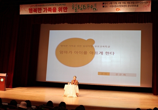 【경기인뉴스】채의선 기자 = 수원시청소년육성재단(이사장 김충영) 수원시청소년상담센터에서는 지난 19일 부모교육특강 ‘행복한 가족을 위한 힐링타임’의 두 번째 강의를 진행하였다. 이날 행사는 염태영 수원시장의 축사로 시작하였으며, 염태영 시장은 자녀교육에 열의를 가지고 모인 학부모들을 격려하고, ‘사람이 반가운 휴먼시티’에 대한 수원시의 정책 방향에 대해 설명하는 시간을 가졌다. 이어서 한국알트루사여성상담소 문은희 소장이 ‘엄마가 아이를 아프게한다’라는 주제로 강의하였으며, 자녀와 분리되지 못하는 ‘포함’의 삶을 살아가는 우리 사회 어머니들에 대해 이야기 하였다. 문소장은 자녀와의 건강한 분리를 강조하였고, 자녀의 말과 행동에 집중하여 줄 것을 당부하였다. 또한 현재 청소년의 문제를 사회적인 시각으로 바라보고, 환경 운동과 같이 정신건강 운동의 필요성에 대해 말하였다. 수원시청소년상담센터에서는 4월 26일 금요일 10시~12시까지 세 번째 강의를 진행한다. 세 번째 강의는 ‘부모, 누구도 대신할 수 없다’라는 주제로 21세기 부모교육연구소 이재택대표가 ‘모든 부모들이 반드시 알아야할 대한민국 부모역할’에 대한 강의가 있을 예정이다.