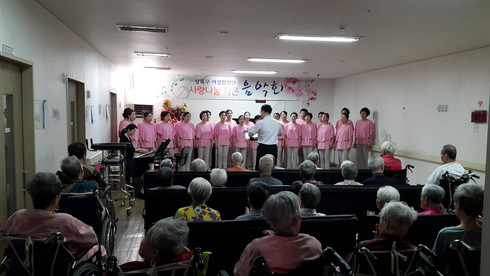 휠체어를 타고 또는 요양보호사들의 부축을 받고 나오신 어르신들은 즐겨 불렀던 다정하고 친근한 노래들이 한곡 한곡 연주 될 때마다 박수치고 흥겨워하며 즐거운 시간을 보냈다.
