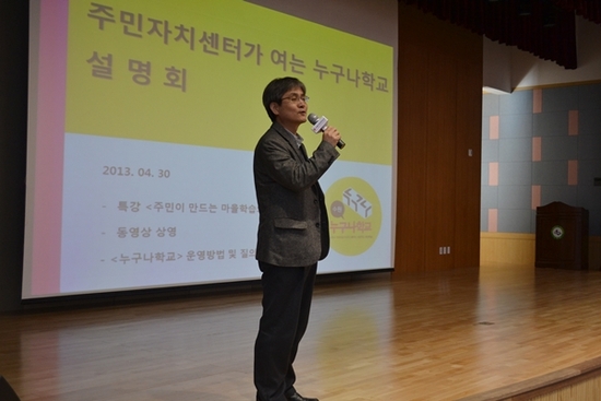 【경기인뉴스】이연수 기자 = 수원시평생학습관은 지난 30일 동장, 주민자치위원, 통장, 시민 등 200여명이 참석한 가운데 주민자치센터가 여는 누구나학교 사업제안에 대해 설명회를 개최했다. 이번 설명회는 정성원 관장(수원시평생학습관)의“주민이 만드는 마을학습의 시대”에 대한 특강과 함께 누구나학교 운영방법 안내 및 질의응답으로 진행됐다. 누구나학교는 강의 자격증이 없어도 누구나 자신만의 노하우나 삶의 지식을 이웃들에게 전해줄 수 있는 신개념 평생학습 프로그램이다. 정성원 관장은 “누구나학교가 어디서나 열릴 수 있도록 지원센터로서 역할을 확대할 예정이다”라고 말했다. 누구나학교에 관심있는 시민은 누구나학교 홈페이지( http://nuguna.suwonedu.org)를 참조하거나 수원시평생학습관 교육팀(070-7727-6512)로 전화하면 된다. 한편, 누구나학교는 지난해 6월부터 추진했으며, 현재(2013년 4월 기준) 180여개의 강좌가 개설, 80명의 강사와 1,830명의 학습자가 참여했다.